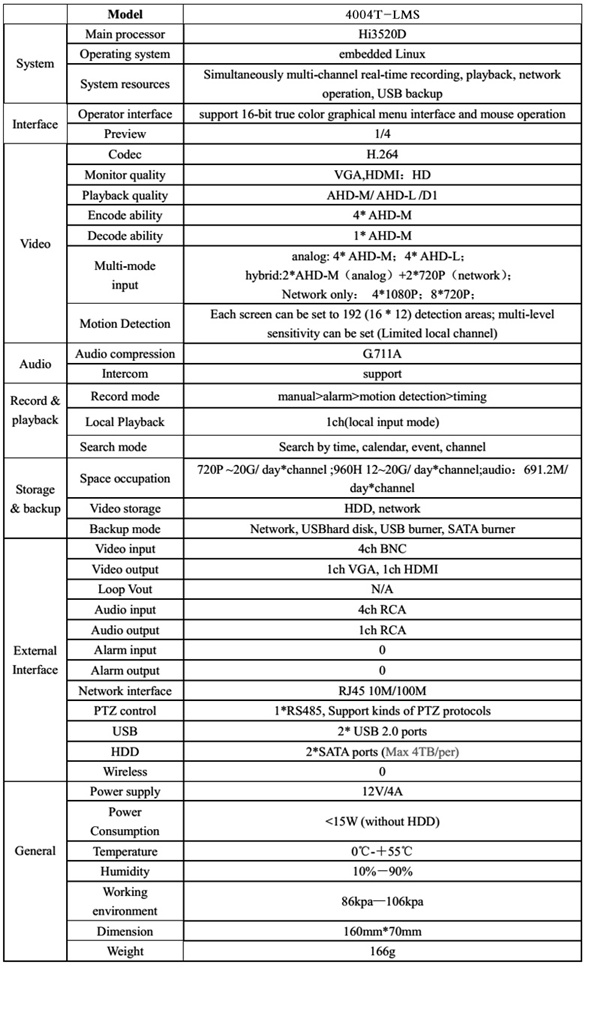 -All channel 720P@25/30FPS realtime recording, 1/4CH playback simultaneously