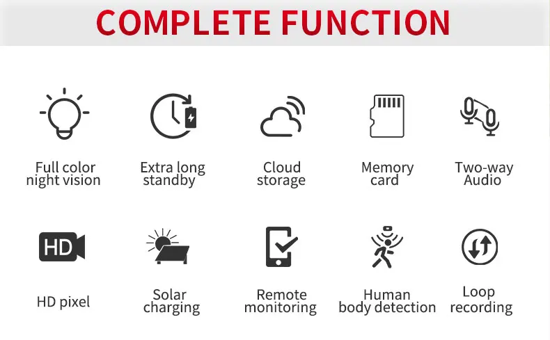 Function | Two-way Audio, PAN-TILT, RESET, Built-in Mic, NIGHT VISION, Waterproof / Weatherproof, Wide Angle, Built-in Siren, Vandal-proof |