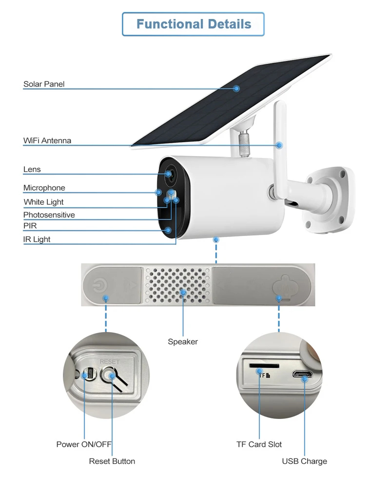 Note: This solar ptz camera is with 6W solar panel (Built-in 3pcs 21700 rechargeable battery 15000mA).) It can use without any sunshine, but normally it works permanently for outdoor, which means it never power off when it is installed under the sun.