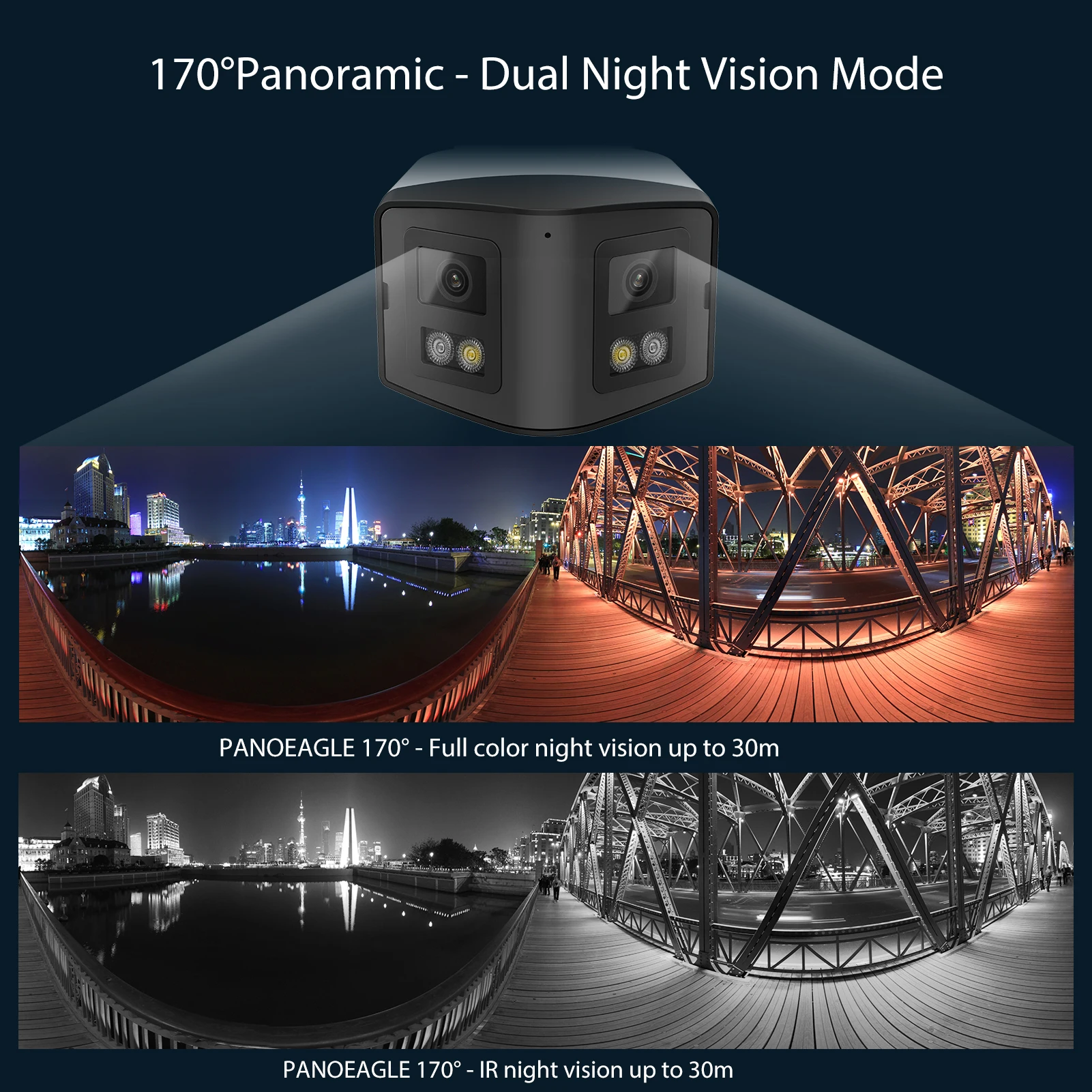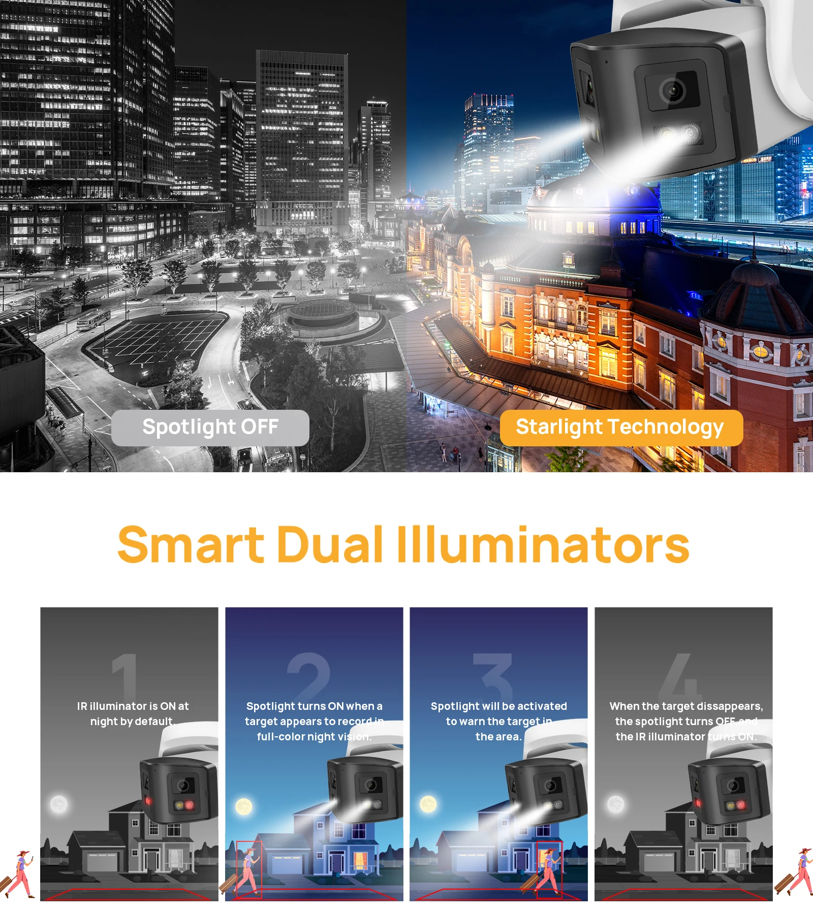 >Smart dual light model to show IR night vision when human break in the white light will automatically turn on to show full color night vision for Active Deterrence.