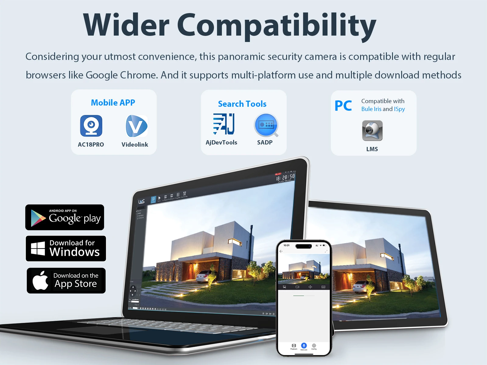 Considering your utmost convenience, this panoramic security camera is compatible with regularbrowsers like Google Chrome. And it supports multi-platform use and multiple download methods