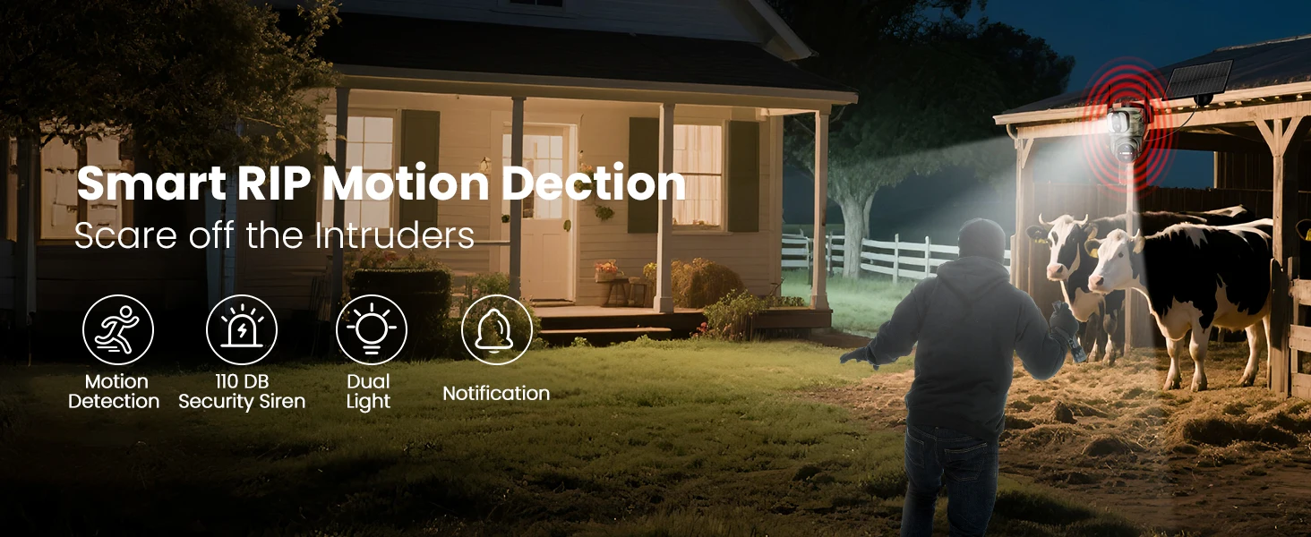 100% wireless and solar powered: no cables, no sockets, no hassle. The built-in 6W solar panel and rechargeable 14400mAh battery keep the surveillance camera working day and night and use the power of the sun for uninterrupted safety.